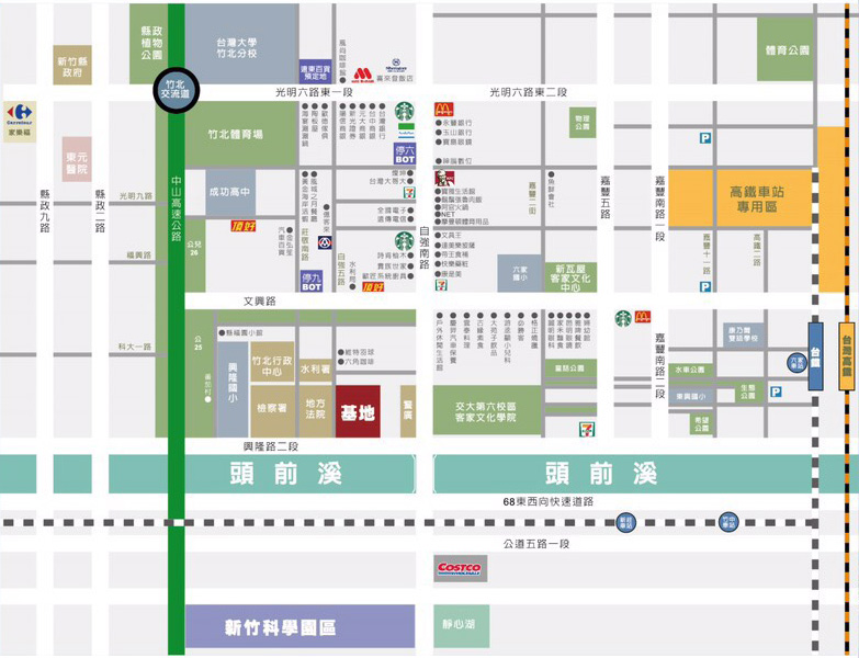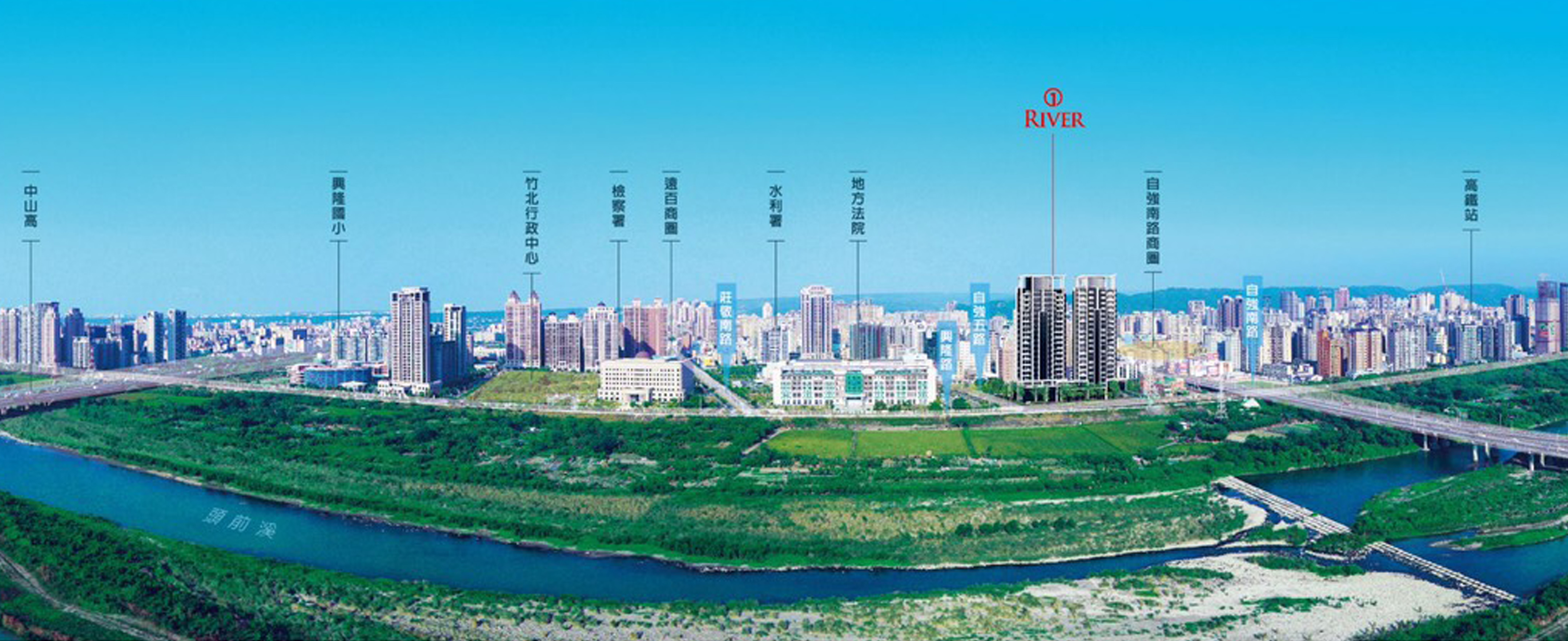 頭前溪首席角地街廓,竹北地院為鄰,左抵國1高速公路、右倚新竹雙鐵共構,前望新竹科學園區,擁有商圈、學區和生活機能完整優勢!