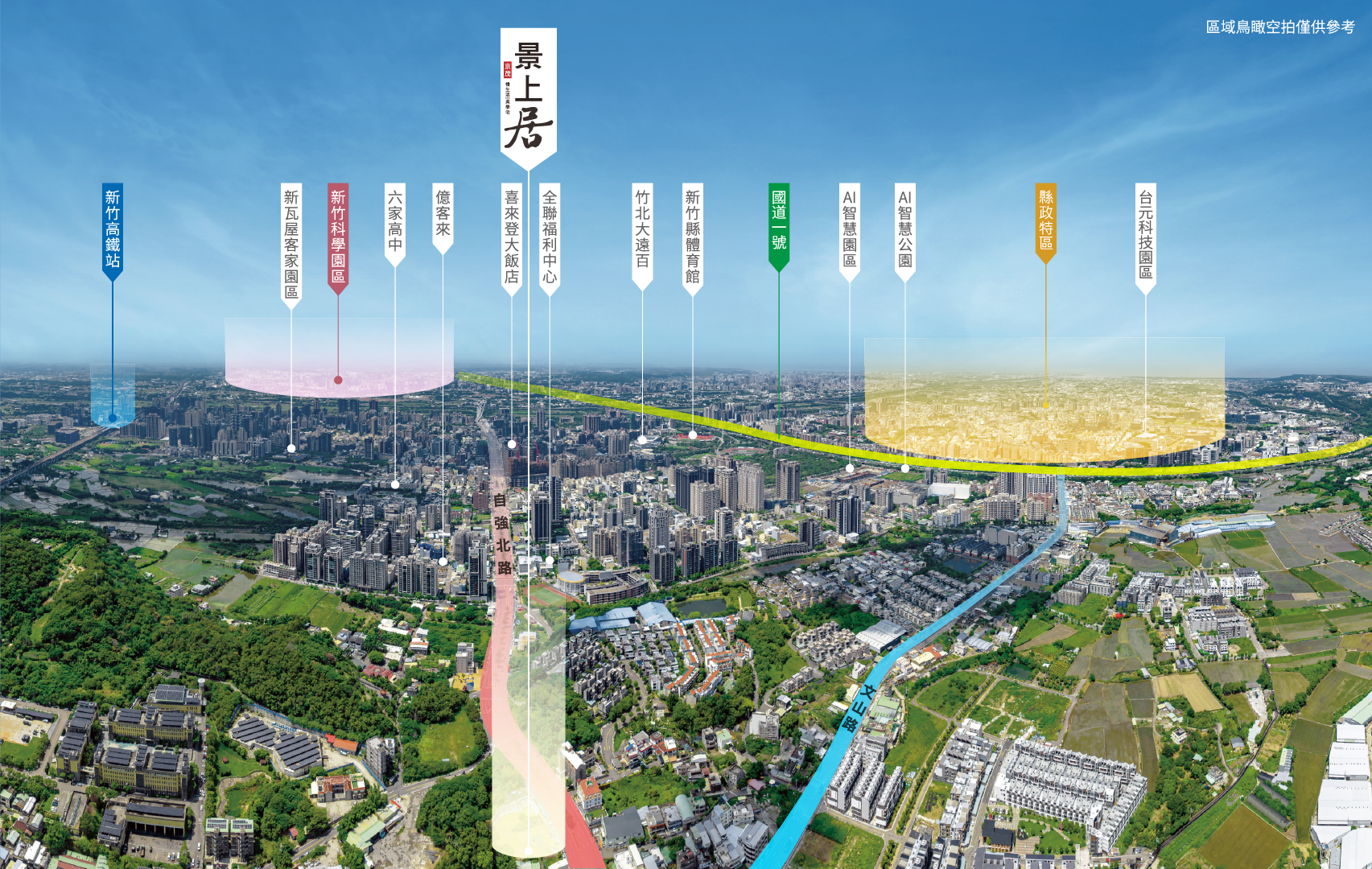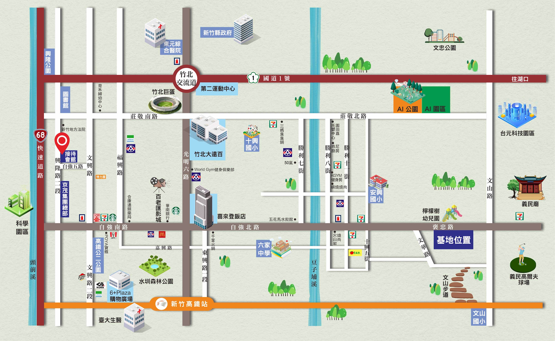 『景上居』位居竹北門戶,正對自強北路繁榮大道, 自強北路直上經國大橋通往竹科,交通便捷, 5分鐘快速串聯竹北超級生活圈,輕鬆跨步便利: 約3分鐘喜來登商圈、約5分鐘遠百生活圈、 約10分鐘高鐵通勤圈,時時刻刻隨心所欲,悠遊城市繁華一靜。